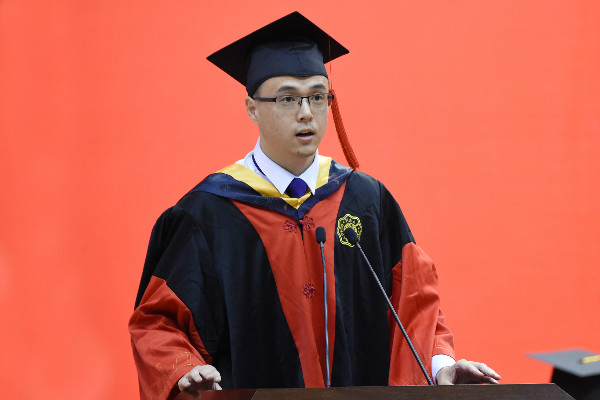 毕业研究生代表徐炜同学讲述了自己与河海结缘的故事,结合自身的求学经历与大家分享了对社会责任感的认识,表示将不忘导师教诲、不忘学校校训,爱水爱校,恪守学术道德,勇于探索科学问题,将自身发展与推动人类知识的进步和社会的发展结合起来。