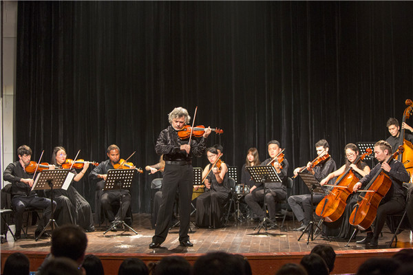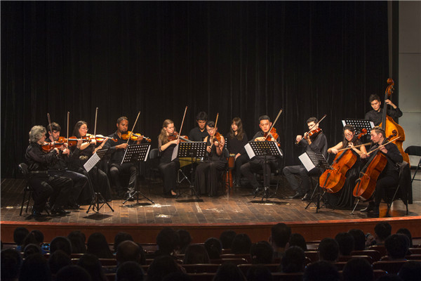 亚历山大室内乐团不仅演奏了《庆丰收》、《黄河》、《茉莉花》、《花儿为什么这样红》等经典的中国乐曲,还为大家带来了《古老风格组曲》、《圆舞曲》等9首富有特色的西方音乐作品。乐团成熟的演奏技巧配合激情的演绎,以及亚历山大先生对于室内乐以及乐曲的介绍,完美细腻的诠释了作品内容,给在场的师生以强烈的视听震撼。演出结束后,全场观众起立鼓掌,音乐家们被观众的热情感染,另演奏了两首返场作品。