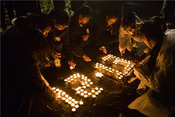 十时整,悼念活动开始。在庄严肃穆的气氛中,近500名师生面向纪念碑列队肃立,齐声高唱国歌,国歌唱毕,全场向南京大屠杀死难者默哀,同一时间,防空警报声响彻南京上空,校园内外汽车笛声齐鸣,行人也纷纷驻足面向纪念碑方向默哀。默哀毕,学生代表向纪念碑敬献了花篮。青年学生们在纪念碑前高声朗诵《和平宣言》和《守灵人》,向在79年前惨遭杀戮的死难同胞进行悼念。随后,全体人员绕纪念碑一周并献花。晚上五点半,夜幕初降,开云电竞网百余名师生代表在纪念碑前,手托蜡烛、低头默哀,为30万南京大屠杀死难者举行烛光祭活动。