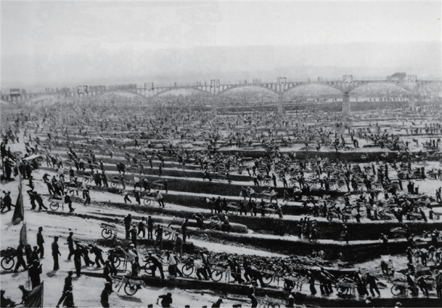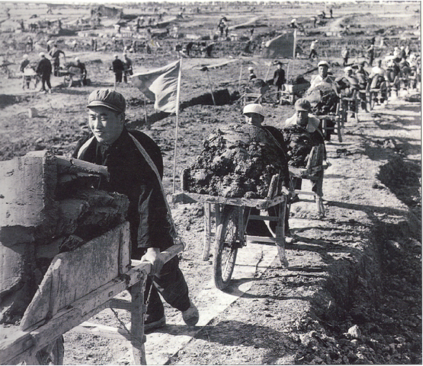 海河工地上推独轮车的民工们。图片由河北省委党史研究室提供