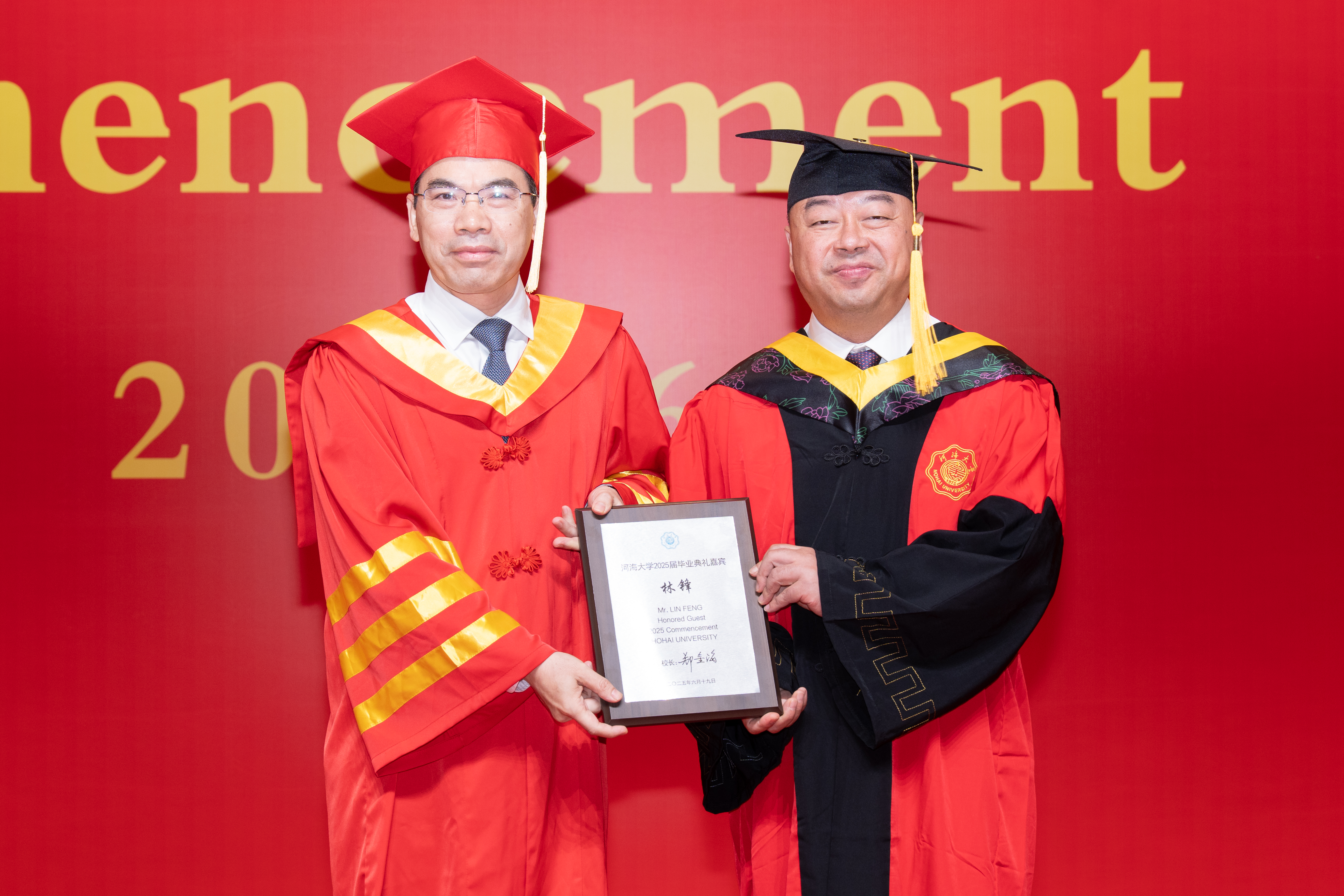 典礼嘉宾、1991级人资及行政管理专业杰出校友林锋向毕业生们表示最诚挚的祝贺,向母校和老师们致以最崇高的敬意。他结合自身学习和工作生活经历与毕业生们分享四点感悟:深植报国之志、点燃青春理想,践行河海精神、勇于扎根基层,坚持终身学习、拥抱未知挑战,永远向阳而生、追求价值人生,在求知问道中锤炼品格,在创新创造中开拓视野,以凌云之志谱写属于青年一代的壮美诗篇。