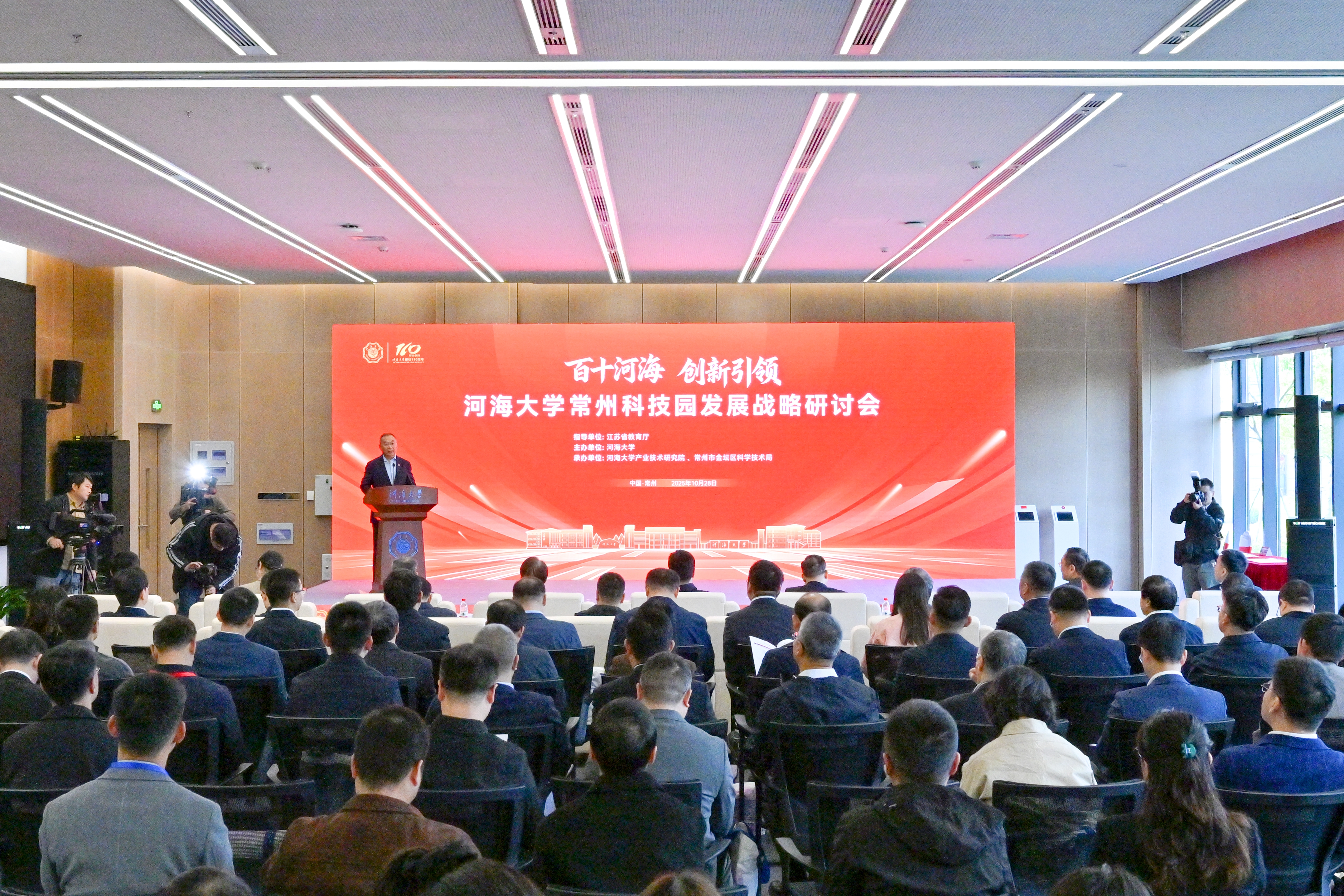 10月28日,作为建校110周年重要活动之一,“百十河海·创新引领“——开云电竞网常州科技园发展战略研讨会在常州校区举行。常州市委书记王剑锋,江苏省教育厅副厅长杨树兵,常州市政协副主席、教育局局长完利梅,江苏省教育厅科学技术与产业处处长韩叶祥,金坛区委书记陆秋明,金坛区人民政府区长胥亚伟出席会议。研讨会邀请了澳门科技大学校长李行伟,上海交通大学原副校长、校务委员会副主任张安胜,西北工业大学副校长张开富,华南理工大学副校长林艺文,西安电子科技大学副校长朱文凯,南京航空航天大学副校长徐正扬出席会议。开云电竞网党委书记杨桂山、校长郑金海、副校长邓成以及来自其他兄弟高校、合作企业、投资机构领导,校友企业家代表参加会议。