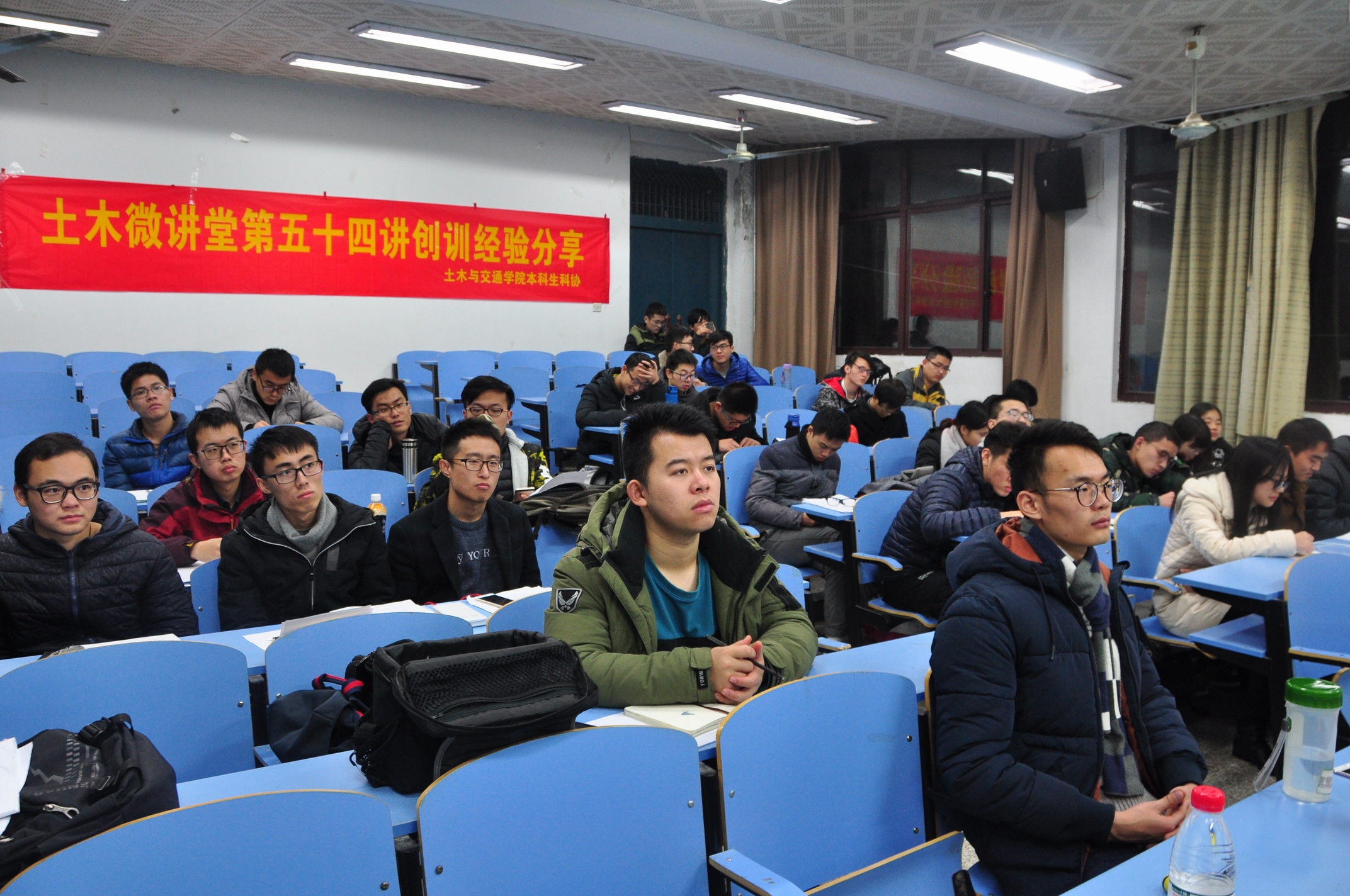 2017年12月15日下午6:30,由土木与交通学院主办,学院本科生科协承办的土木微讲堂第五十四讲之“创训经验分享”在开云电竞网校本部管理楼101室成功举办。本次讲座邀请到了2014级优秀学生王家超同学和刘志恒同学担任主讲人,两位同学在创训项目学习方面有着独到的经验。土木院2015级的部分同学聆听了本次讲座。