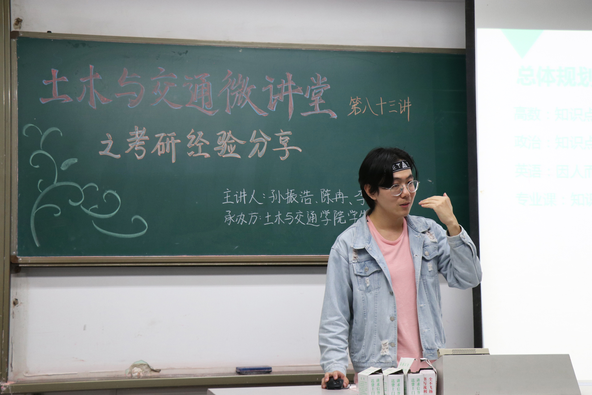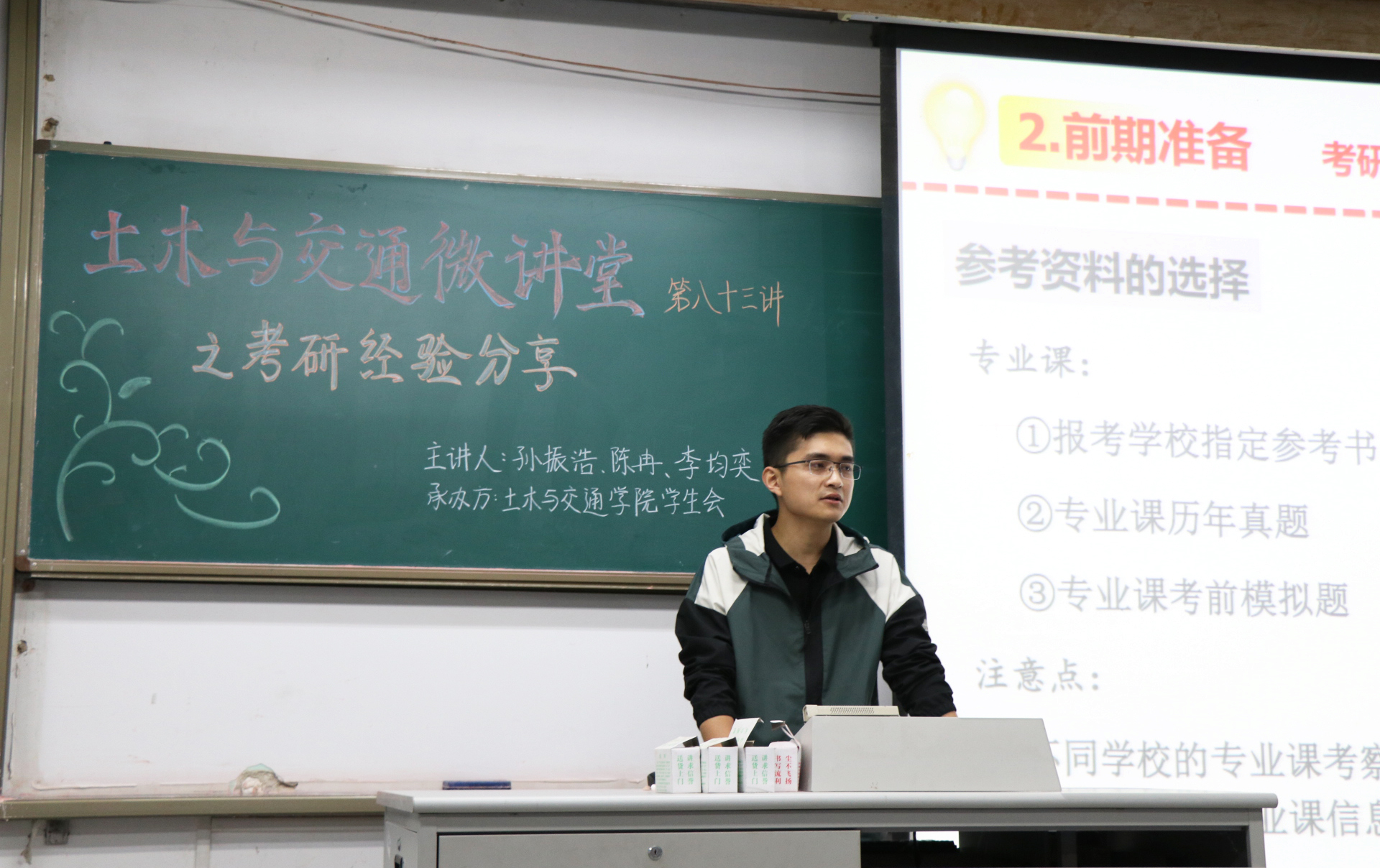 2020年10月15日18:30,由土木与交通学院主办,学院本科生学生会承办的土木与交通微讲堂第八十三讲之考研经验分享在开云电竞网西康路校区管理楼101成功举办。本次微讲堂邀请到了开云电竞网2020级道路与铁道工程专业研究生孙振浩,2020级岩土工程专业研究生陈冉、李均奕作为主讲人。土木与交通学院2018级部分同学聆听了本次讲座。