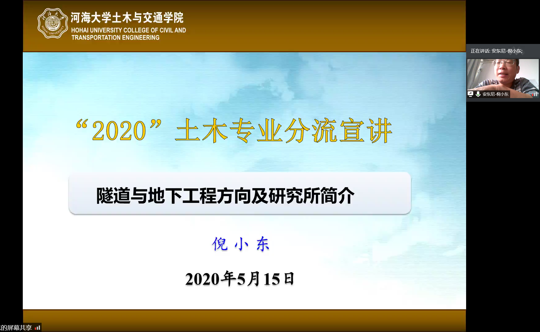 2020年5月15日14:00,由土木与交通学院主办,学院本科生科协承办的2018级土木工程专业分流会于线上成功举办。本次分流会有幸邀请到岩土工程科学研究所吴跃东老师、结构工程研究所韦芳芳老师、桥梁工程研究所傅中秋老师以及隧道与地下工程研究所倪小东老师担任嘉宾,土木与交通学院2018级辅导员李倩老师、2018级土木专业全体同学以及2018级大禹土木全体同学聆听了此次分流会。