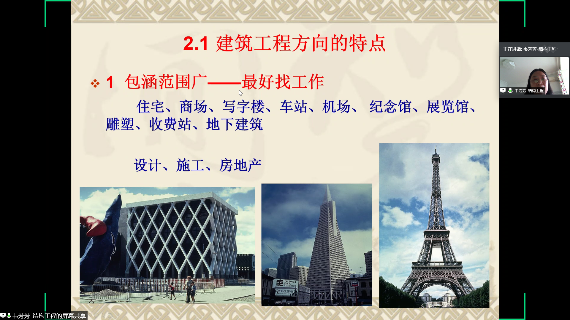 接着,韦芳芳老师在简述了土木工程专业的整体情况后对建筑工程方向进行了详细的介绍。建筑工程在本科阶段的课程主要分为理论课、实践课和选修课三部分,建筑工程方向的特点为包涵范围广、结构形式多姿多彩、工程量大、学习内容全面以及成就感强。韦芳芳老师同时介绍了建筑工程方向任课教师的基本情况、教学成果以及未来的发展方向。韦芳芳老师提到土木工程专业各方向之间是交叉、互补、融合与团结合作的关系,并鼓励同学们在专业分流时能够选择建筑工程方向,希望同学们能够成为更好的自己。