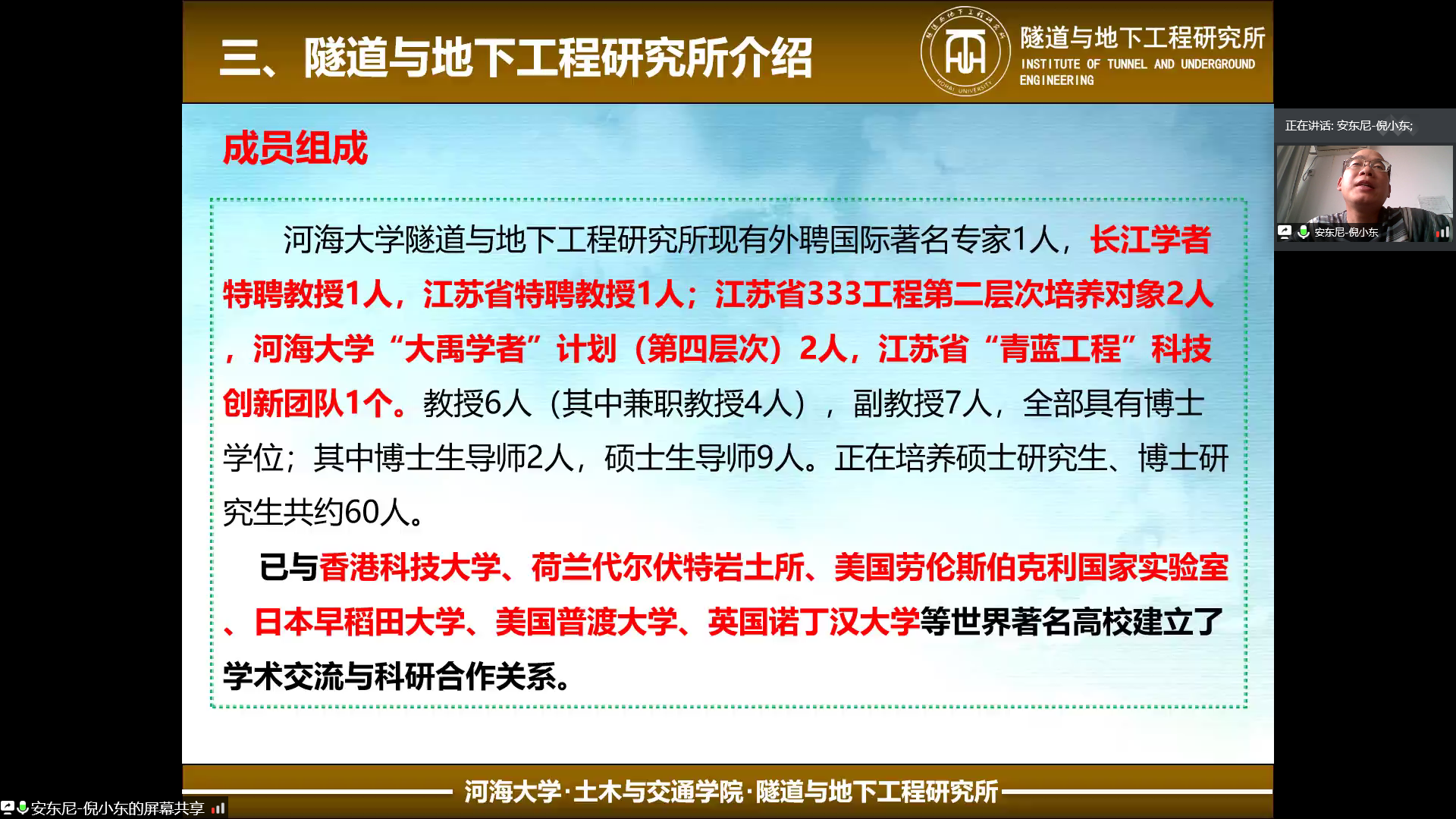 最后,由倪小东老师为同学们介绍隧道与地下工程。老师首先介绍了隧道与地下工程方向本科阶段的培养方案,并通过讲解地下工程的分类等方面详细介绍了我国隧道与地下工程的发展现状。紧接着倪小东老师又介绍了隧道与地下工程研究所的师资情况、重点研究方向和主要的科研课题。倪小东老师还分析了同学们最关注的隧道方向人才培养的成果以及就业形势。通过老师的介绍,同学们对隧道工程有了更加全面深刻的了解和认识。