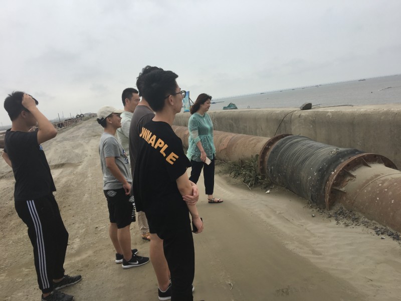 实践期间,调查小组来到南通市海域使用动态监管中心的办公地点。在其秦主任的介绍下,调查小组基本了解了南通围垦地的分布及其利用的基本情况。随后在秦主任的带领下,调查小组来到启东,开始实地调查。在圆陀角组员们了解到了完成变海为陆的工程需要经过围堤、吹填、去盐碱和沉降四个步骤。在参观中国最大人工渔港的吕四渔港时,调查小组看到了河海前辈设计的水闸,其构思新颖,形状奇特,让组员们深深慨叹。