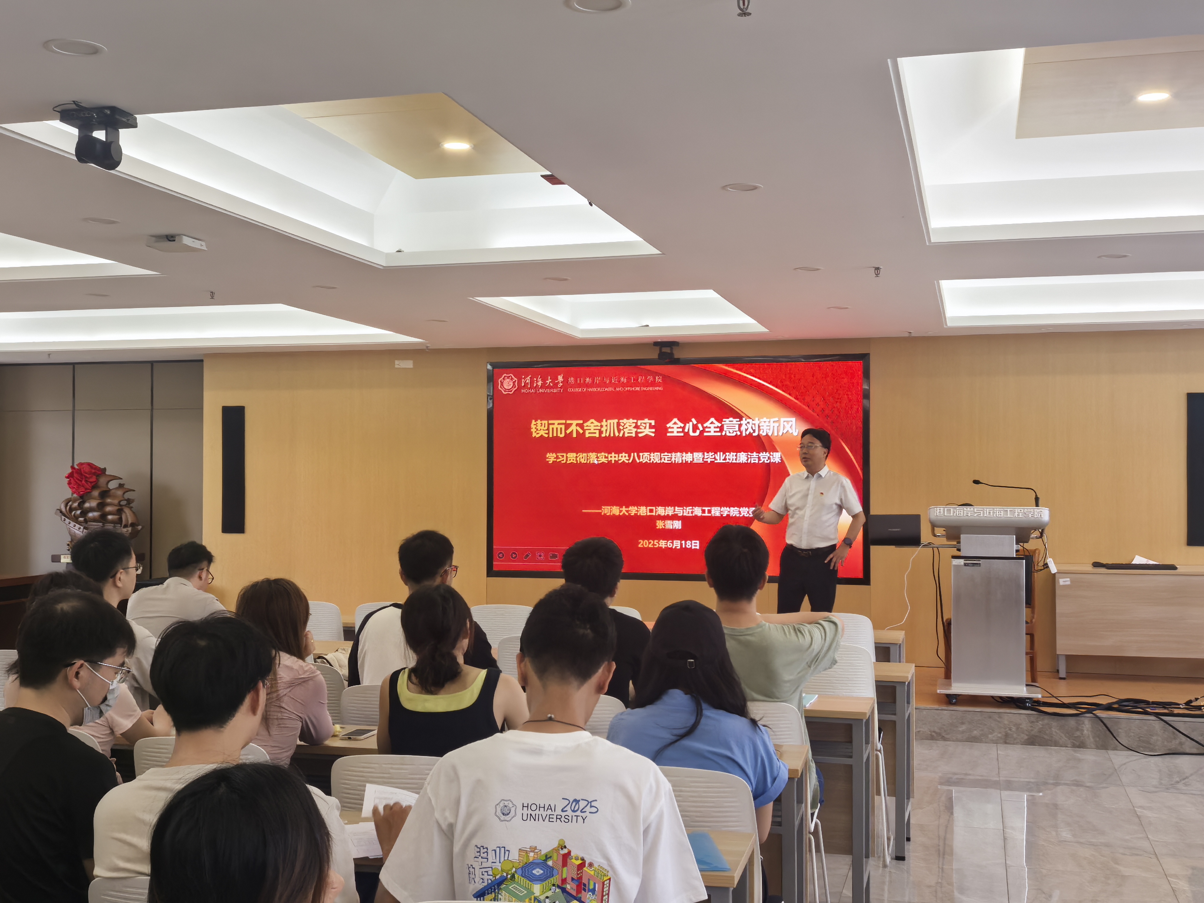 6月18日,为扎实开展深入贯彻中央八项规定精神学习教育,学院党委张雪刚书记为2025届毕业生党员讲授廉洁党课。学院党委副书记王玲、毕业生辅导员、全体毕业生党员参加党课。