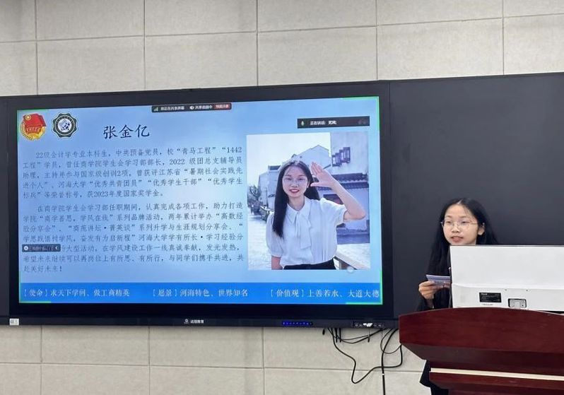 商学院学生会第三十五届主席团成员陈雪阳同学做了题为《承前启后筑新梦,踔厉奋发谱华章》的工作报告。她总结了在过去的一年中商学院学生会取得的优异工作成果:商学院学生会始终注重商院学生的思想引领,通过多点开花,亮点纷呈,面上结果的活动架构力求加强商学院学风建设。此外,商学院学生会以且思且行,且悟且进为行为准则,时刻反思自我,充分发挥干部主观能动性,推动组织建设。同时,陈雪阳同学也对开云电竞网商学院学生会做出以下展望,一是要筑牢思想基础,持续深化改革;二是强化服务意识,为学生权益“发声”;三是创新工作模式,保持组织特色;四是强化对外交流,开放包容新格局。
