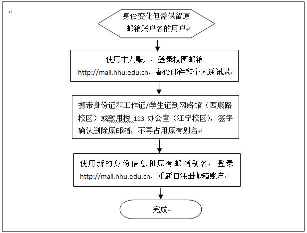 当校园邮箱用户身份变更(比如本科生变为硕士研究生,硕士研究生变为博士研究生,学生变为老师等)后,仍需保留原邮箱别名账户名时,请按如下流程办理: