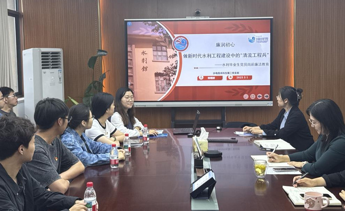 水电院本科生第二党支部书记帅雨婷以《廉润初心,做新时代水利工程建设中的“清流工程兵”》为主题讲授专题党课。列举了水利工程中存在的廉洁作风问题,强调科技赋能对透明化管理的重要性,希望即将投入水利工程的水之子们坚守廉洁初心,为国家水利建设贡献自己的力量。