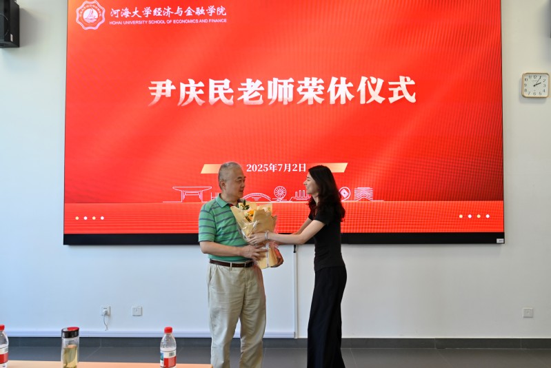为进一步弘扬尊师重教优良风尚,增强退休教职工的荣誉感、归属感和幸福感,激励青年教师传承老一辈爱岗敬业的教育情怀。7月2日,经济与金融学院在常州校区33号楼102会议室举行尹庆民老师荣休仪式。学院全体班子成员、教职工参加了荣休仪式,学院党委书记李娜主持荣休仪式。荣休仪式上,庞庆华院长向尹庆民老师赠送荣休纪念品,金融系教师代表金宇彤老师向尹庆民老师献上鲜花。尹庆民老师深情回顾了在学校、学院的工作历程,对学院和同事给予自己的帮助表示感谢,并真切的表达了对学院未来的美好祝愿及对所有同事的不舍之情。他们表示,在退休之后将继续关心支持学院发展建设,离岗不离心,竭尽所能发挥余热、贡献自己的力量。学院党委书记李娜介绍了尹庆民老师在学院的工作经历和主要工作成果,并代表学院向荣休教师表达了感谢与敬意。李娜书记讲到尹庆民老师是学院事业的参与者、见证者、贡献者,是学院的骄傲和荣光。希望尹老师继续情牵校园,心系学院,始终如一关心关注支持学院各项工作;将奋斗精神和宝贵经验传承给年轻一代,退休不褪色,当好青年教师的“辅导员”、学生成长的“守护者”、学院发展的“智囊团”和文化传承的“播种机”,同时希望青年一代拿起接力