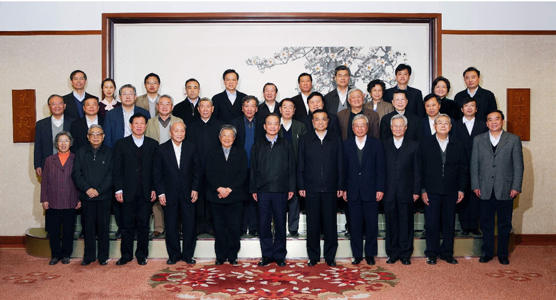 温家宝、李克强听取“浙江沿海开发”项目成果汇报后与专家合影。前排左起:钱易,周干峙,庄来佑,李东英,钱正英,温家宝,李克强,沈国舫,石玉麟,陈志恺,吕祖善。