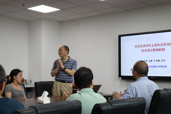 史志华教授主要从事土壤侵蚀机理、景观格局与生态过程等方面的研究和教学工作。在报告会上,史志华教授针对社会经济因素对水土流失作用复杂且多层次、水土流失治理效果依赖于农户行为和意愿等问题,详细阐述了四个关键研究领域,分别是(1)水土流失治理需求的时空变化规律。史教授阐述了人为因素在水土流失治理中的可控性,从而构建反映水土流失治理需求评价指标,识别影响治理效果的社会经济因子,为寻求合理的水土流失治理途径提供了依据。(2)农户社会网络对水土流失治理的影响。史教授首先介绍了农户社会网络的构成,接而通过对比农户社会新型网络与传统网络的异同之处,强调了网络特征、关键节点对水土流失治理的影响。(3)流域社会经济发展对水土流失的驱动。通过对人为和自然因素下流域径流泥沙的演变机制进行分析,史教授剖析了流域水土流失变化的主要驱动力,发现经济发展、农业投入有利于控制水土流失。农业产出的增长加剧水土流失。(4)农产品远程消费对水土流失的影响。分析了供应链与耕地水土流失的关系,发现远程消费需求对耕地水土流失的影响显著;从国家以及全球尺度,发现隐含水土流失都是从不发达地区向发达地区转移,为水土流失治理提供新的视角。